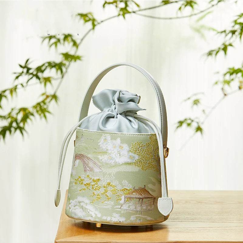 Chinese Painting Mulberry Silk Green Bucket Designer Handbag